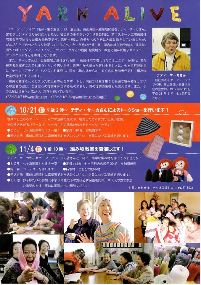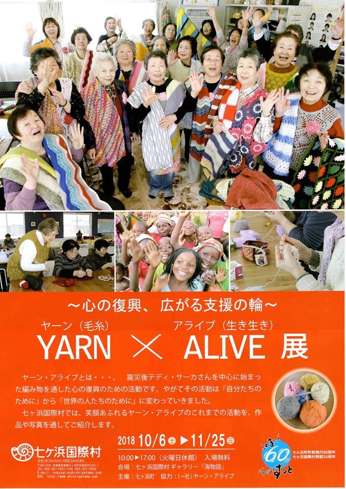 宮城 東松島で東日本大地震以降、編物を通じて活動を続けているYarn Aliveのイベントが開催されます。10月6日〜11月25日と7週間に渡り、今までの活動報告を展示します。