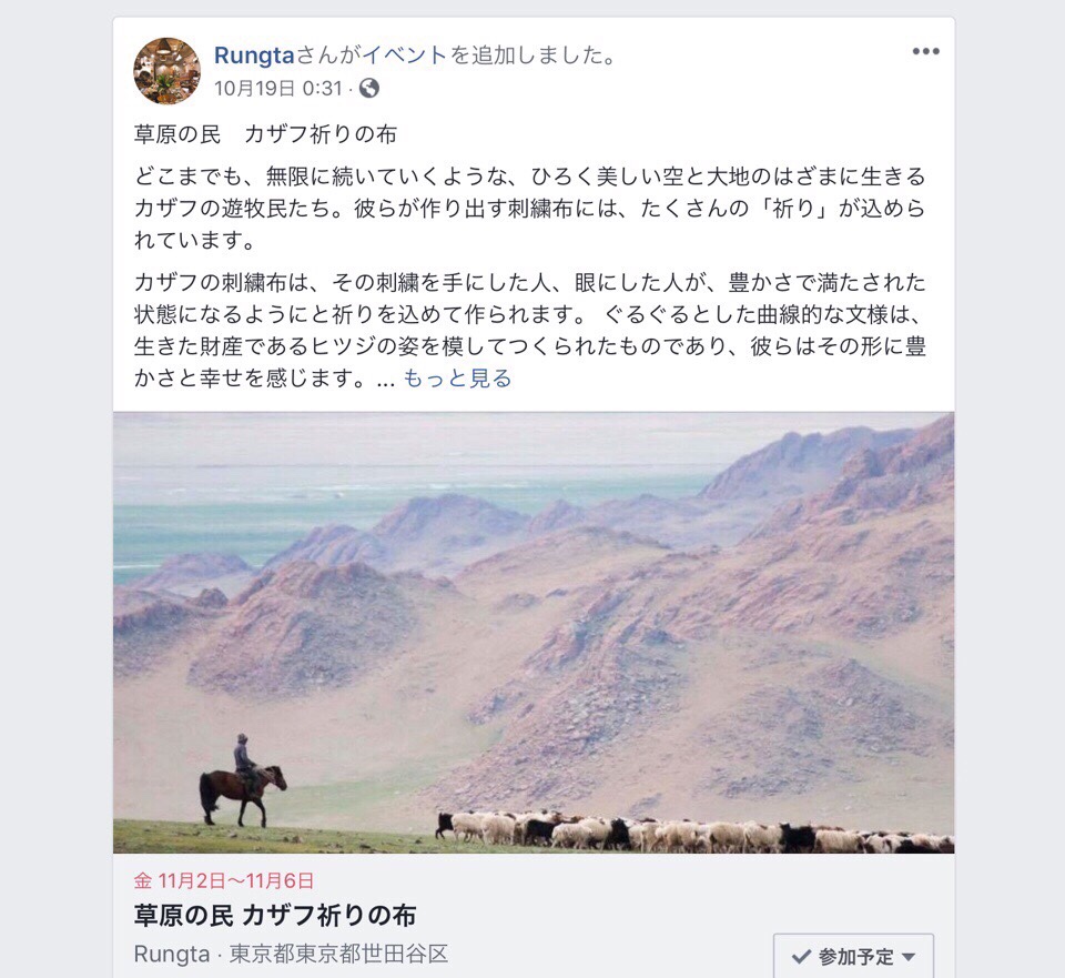 モンゴル西部のカザフ族居住区にて、伝統的な手仕事であるカザフ刺繍を日本に紹介した第一人者。そのカザフ刺繍の展示会が開催されます。