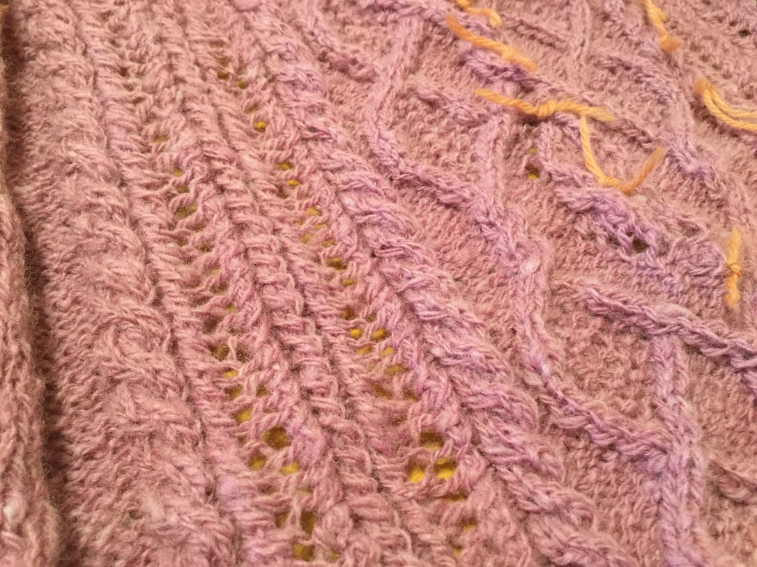 ひたすら紡いで、模様のはめ込みに四苦八苦。サフォークはボリュームが出るので、レーシーなアラン模様にしてみました。