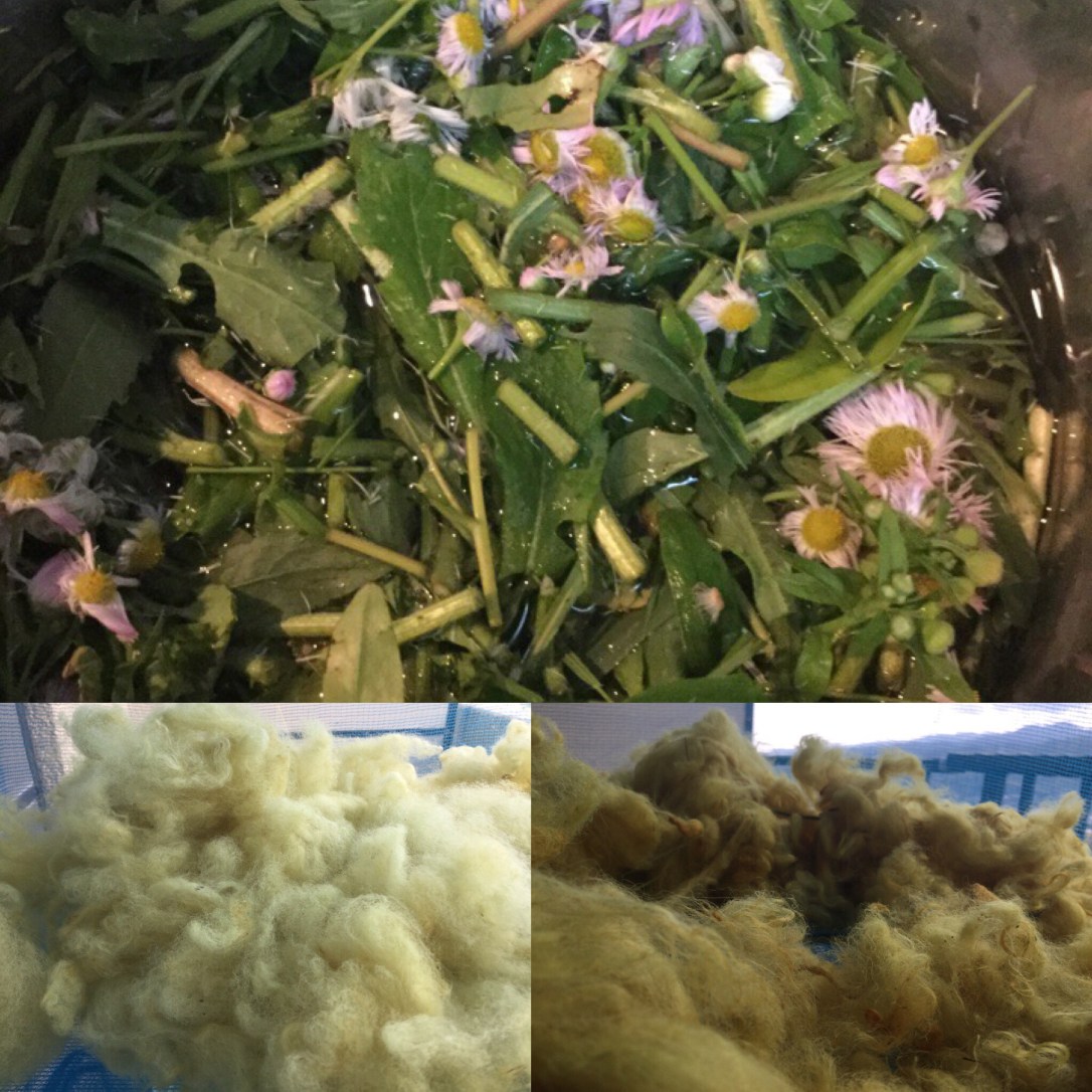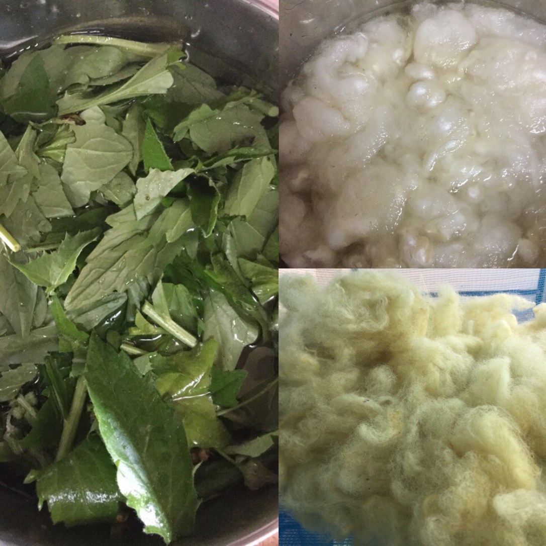 そこでこの連休中に100g追加分を染めることにしました。とにかく緑が出ればいいかなと思い、のげしという雑草を使いました。キク科の植物なのでそこそこ期待していたのですが、どこか物足りない…。