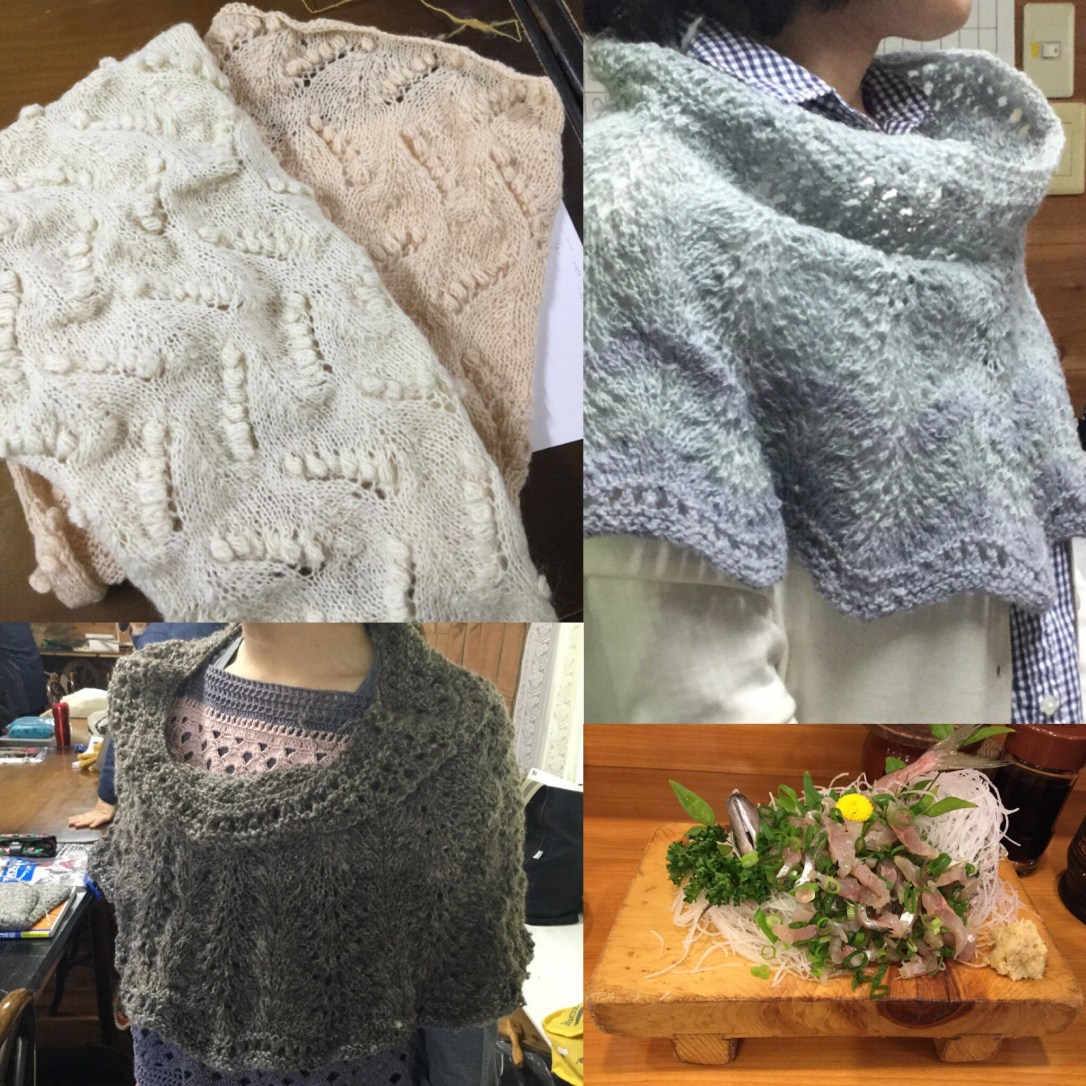 作品のシェアリングは、先生によるすずらん模様のショール2種と課題のネックウォーマー。すずらん柄は単糸などの細い糸がオススメ。ネックウォーマーはさまざまなサイズに仕上がっていましたが、ショールとして使うにはとても素敵だと思います。私は模様も減らしネックウォーマーサイズに編み直しましたが、失敗かと思ってもそれなりの風合いが出てくるものだとつくづく思いました。