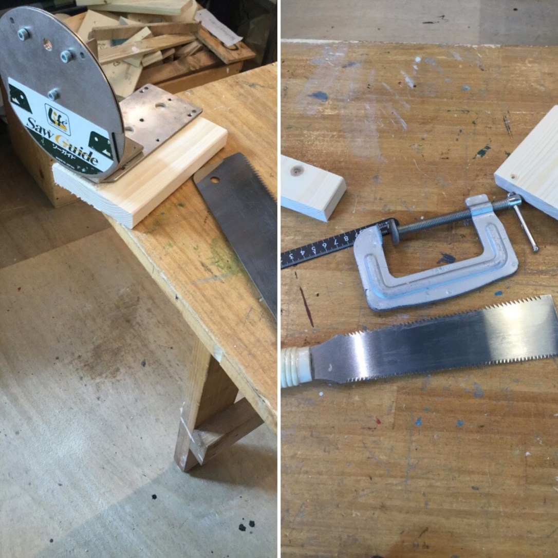 前回はジグゾーを使って板を切りましたが、クランプが動いたり機械自体の押さえが効かなかったりして思うようにいきませんでした。ノコギリも途中でいきなり曲がったりして難しいのですが、落ち着いてゆっくり引けば上手くいきます。左のガイドを使ったノコギリはもっと安定していて、優れものです。