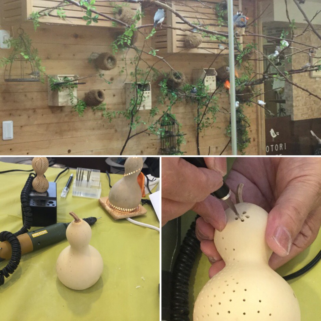 フィンチ類がのびのびと飛び交う店内で、瓢箪と工具類が待っていました。最高のロケーションです。さっそく自由に穴をあけていきますが、ちょっとした法則で綺麗な模様が描けるようになります。