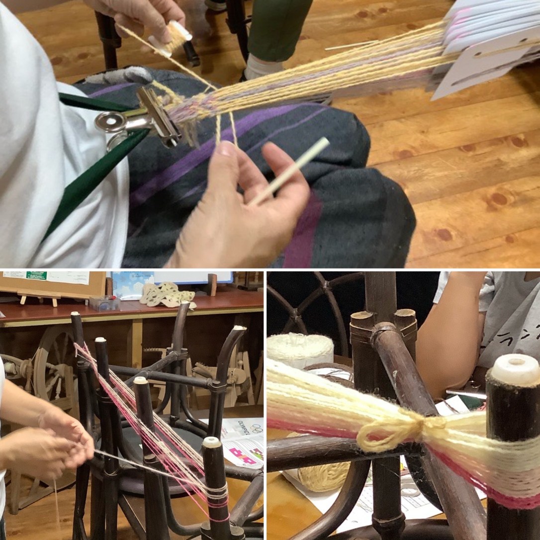 染めがひと段落して、次はいよいよカード織に挑戦。整経台がない場合にはこれ!と言って椅子を逆さに机の上にのせると、にわかに整経台らしき物が登場。さすが織の先生、応用力が素晴らしいです。