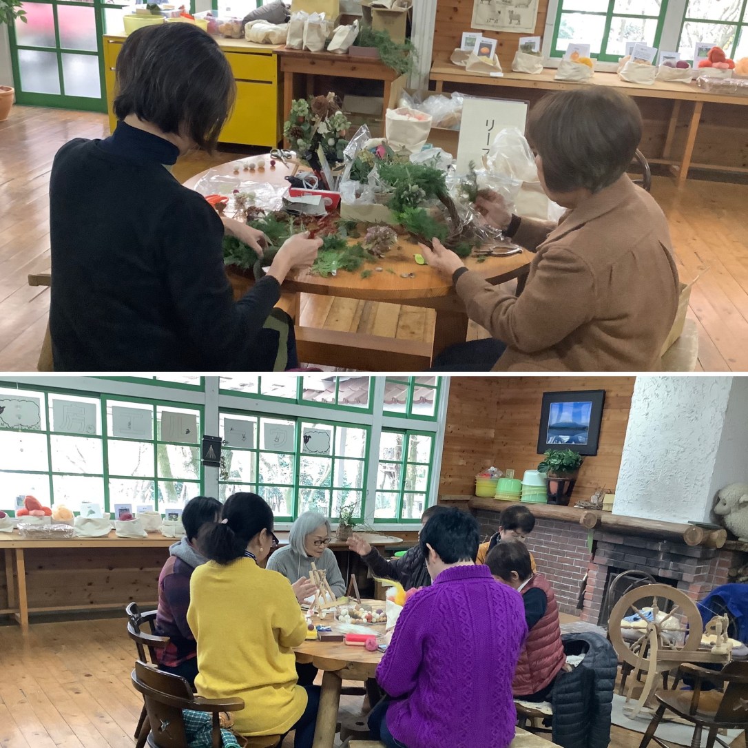 今回はクリスマスリースやニードルフェルトの干支作り、カード織や雪モチーフのモビール作りを用意しました。