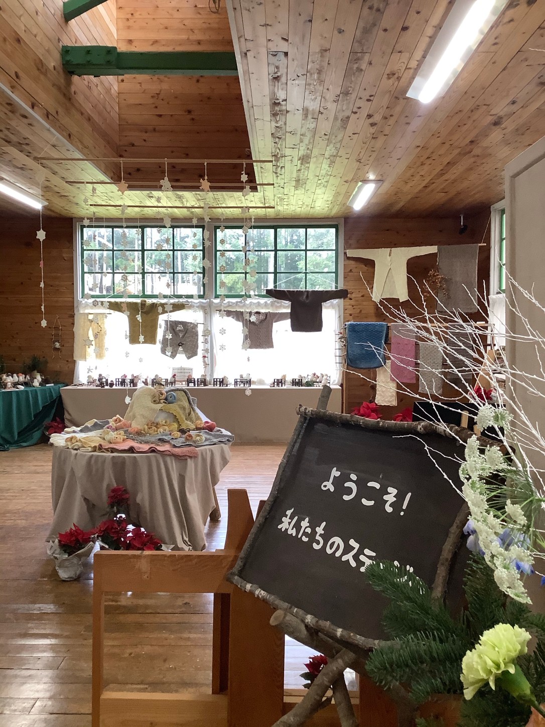 今年はウェアものは少なめですが、課題だったフェアアイル模様の小さなバッグやケープやカード織が並び、雪の結晶のモチーフを飾りに使ったりと華やかな会場になりました。