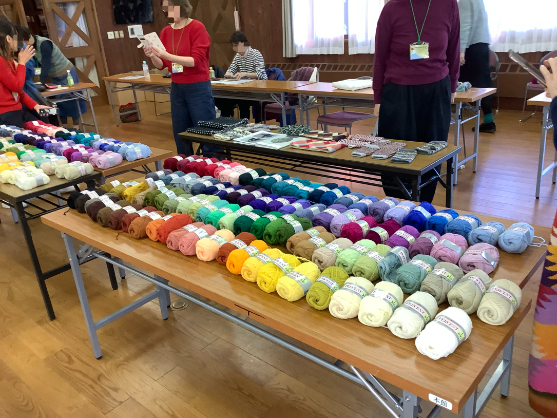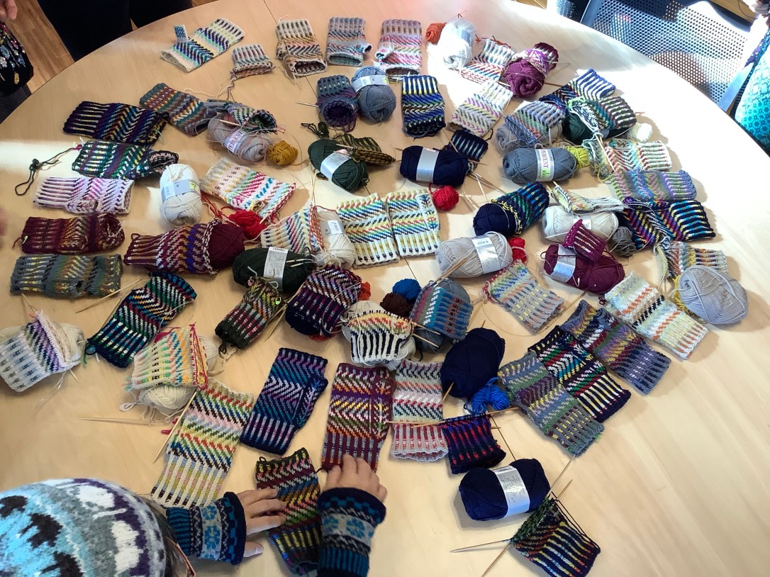 どれ一つとして、同じものがありません。たとえ編み途中でも、結構丁寧に編まれているのでとても綺麗です。この先どんな色が来るのだろうか…と、観る側の想像力を刺激されます。このギャザリングがニッティングデイズの名物でもあり、大変でもあり達成感に浸れる瞬間でもあります。
