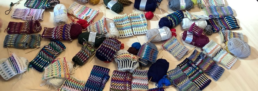 みんな、寝る間を惜しんで完成形を目指します。 今回の課題は、右のジグザグ模様の手袋。左は前回の課題のフェアアイ… 続きを読む 風工房流シェアリング ニッティングデイズ2019